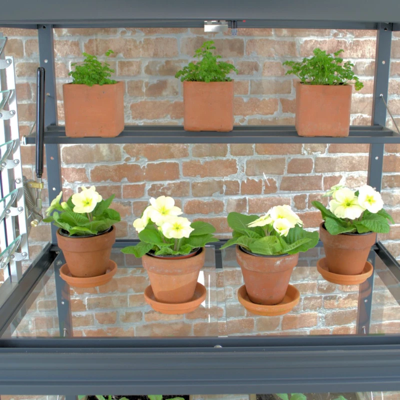 This City Greenhouse benefits from 4mm toughened safety glass, 2 tier mist watering system and 2 adjustable garden seed trays with middle staging.