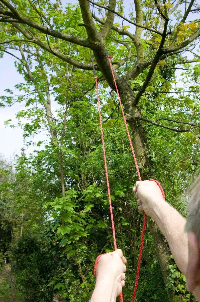 To work at ground level just fix a handle to each end and pull back and forth with slow steady strokes. A 3″ limb can be severed in as little as 15 seconds! For higher growth throw the weighted rope over the limb first and pull up the chainsaw. Complete with a “Trueguide” it will automatically place the teeth onto the branch at the correct cutting position.