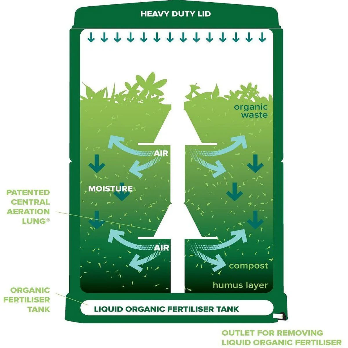 Because of its thick insulation system, nutritious compost takes just 90 days to process. It is then all set to use for your plants and flowers; ideal for herbs, fruits and vegetables as well as flowering plants.
