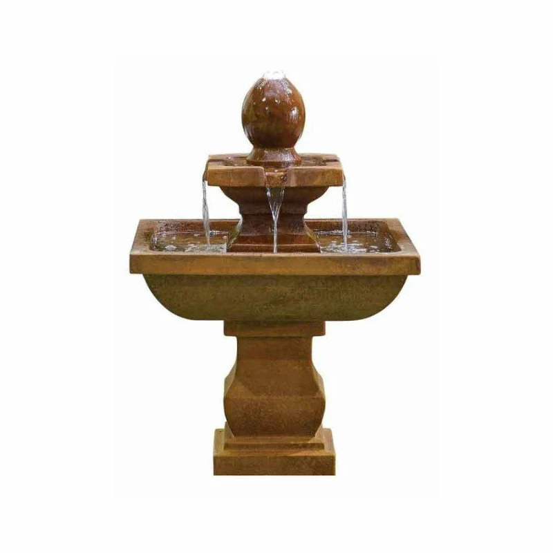 Water will cascade down the water fountain into the two square bowls at the bottom, before being recycled back to the top. This garden water feature has groves on the highest of the square bowls, meaning that water flows from four directions at once.