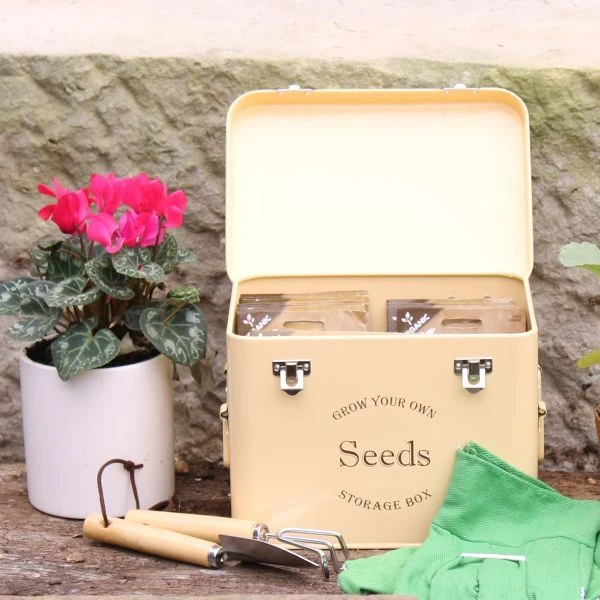 This beautiful vintage cream seed tin packet storage tin is perfect for collecting, storing and keeping seed collections organised and dry. Made from powder-coated steel, complete with metal handles, making it easy to move from the shed or house to the garden. The lid is hinged, and clasps hold the lid secure