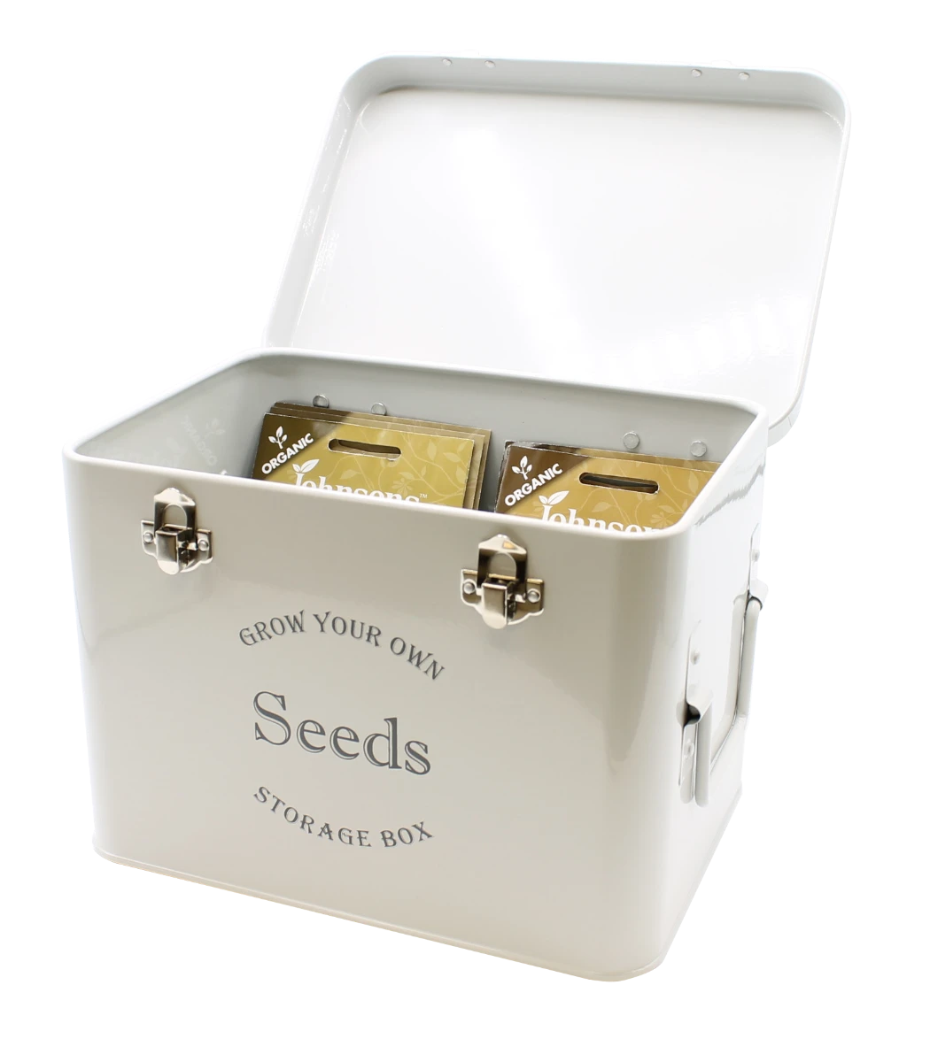 This beautiful french grey seed packet storage tin is perfect for collecting, storing and keeping seed collections organised and dry. Made from powder-coated steel, complete with metal handles, making it easy to move from the shed or house to the garden. The lid is hinged, and clasps hold the lid secure
