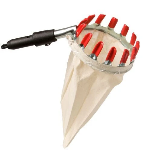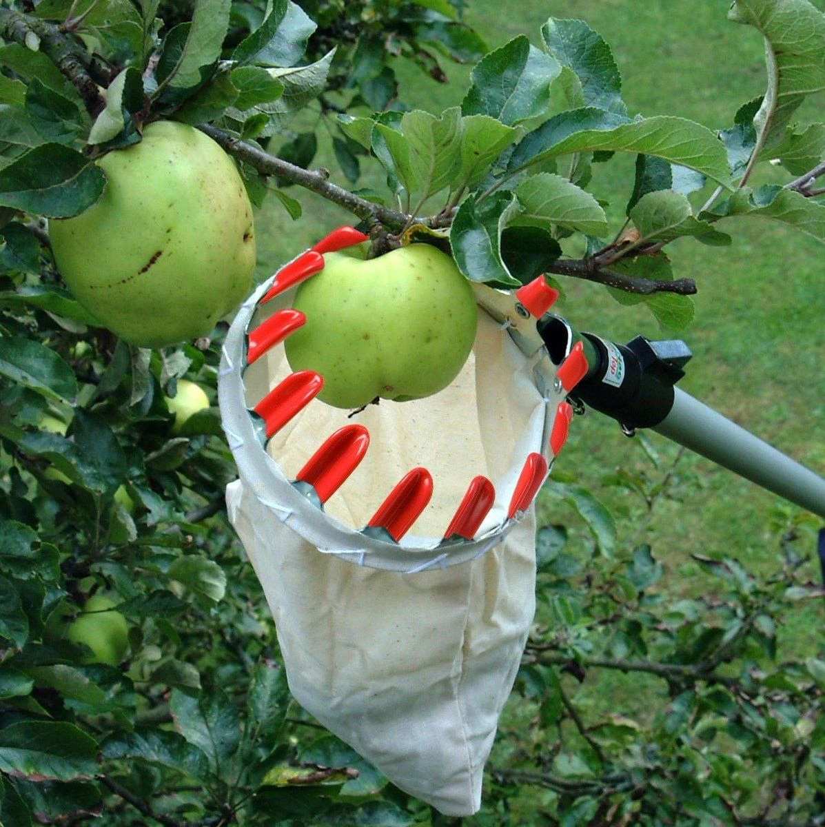 Gently ease the galvanised fingers at the top of the basket over the fruit and round the stem, with a gentle tug the fruit will fall undamaged into the soft bag below.