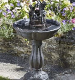 This children tipping pail water feature will add a touch of style to your garden and make a beautiful focal point. The modern solar water feature offers a stylish addition to any garden or outdoor space. No mains connection required. The feature has a bronze effect fountain features two children tipping a bucket.