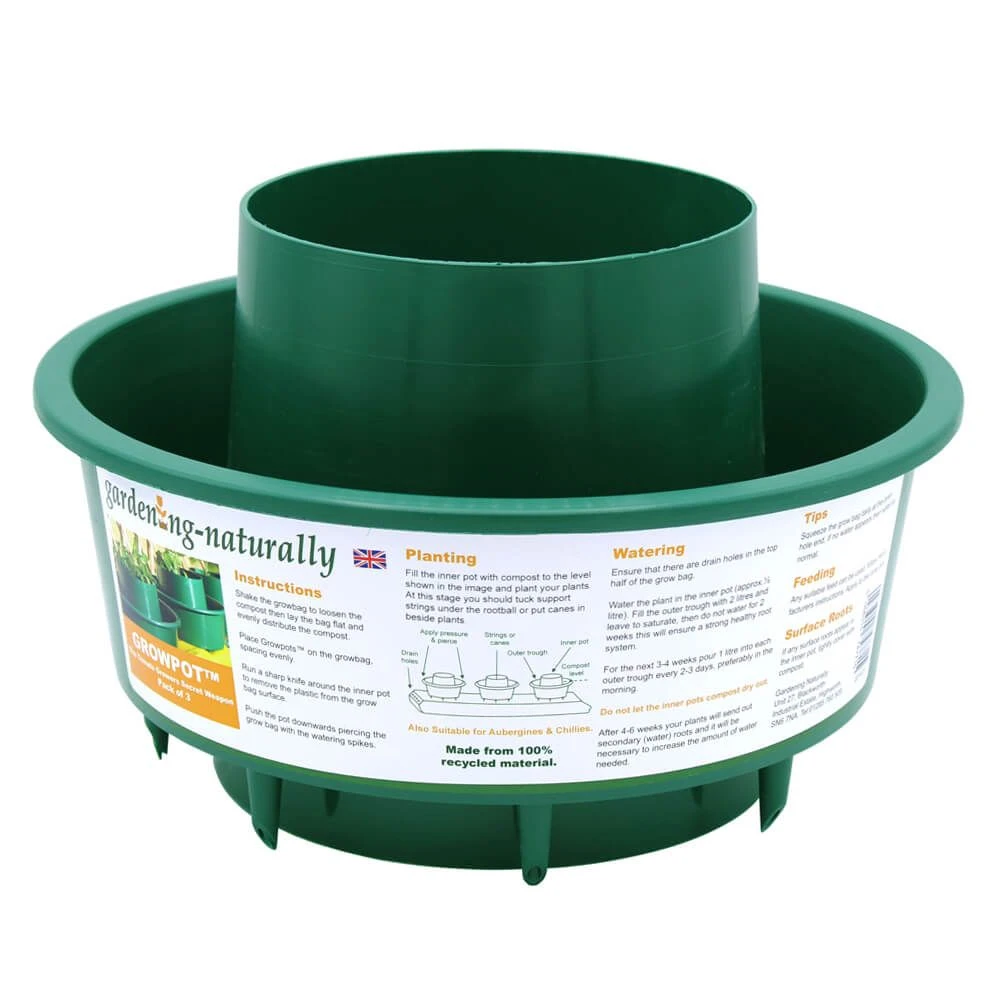 Growpots are proven to give excellent results through accurate feeding and watering especially for tomatoes whilst forming an effective slug barrier around the plant. The outer trough holds four pints of water or feed which then gradually seeps into the compost taking a constant supply directly to the plant root where it is needed most.