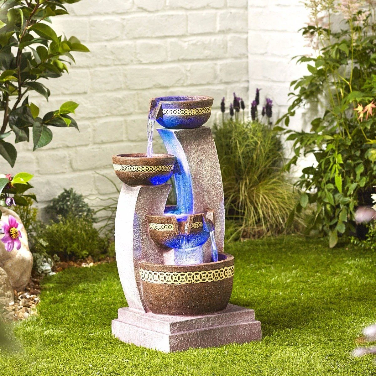 At night time the feature really comes to life with a built in low voltage halogen lights, highlighting the beautifully detailed design and sparkling through the cascading water.