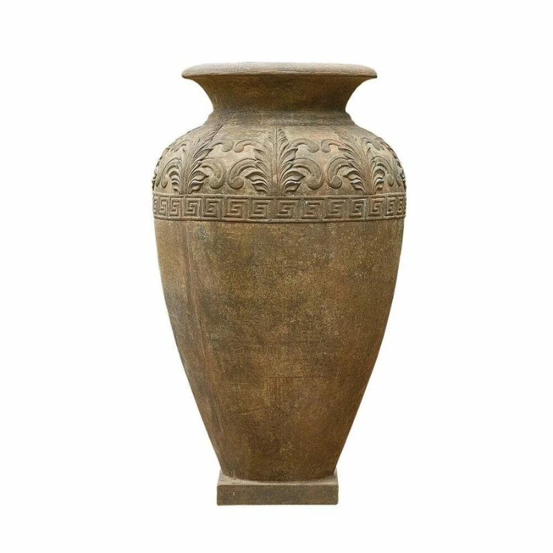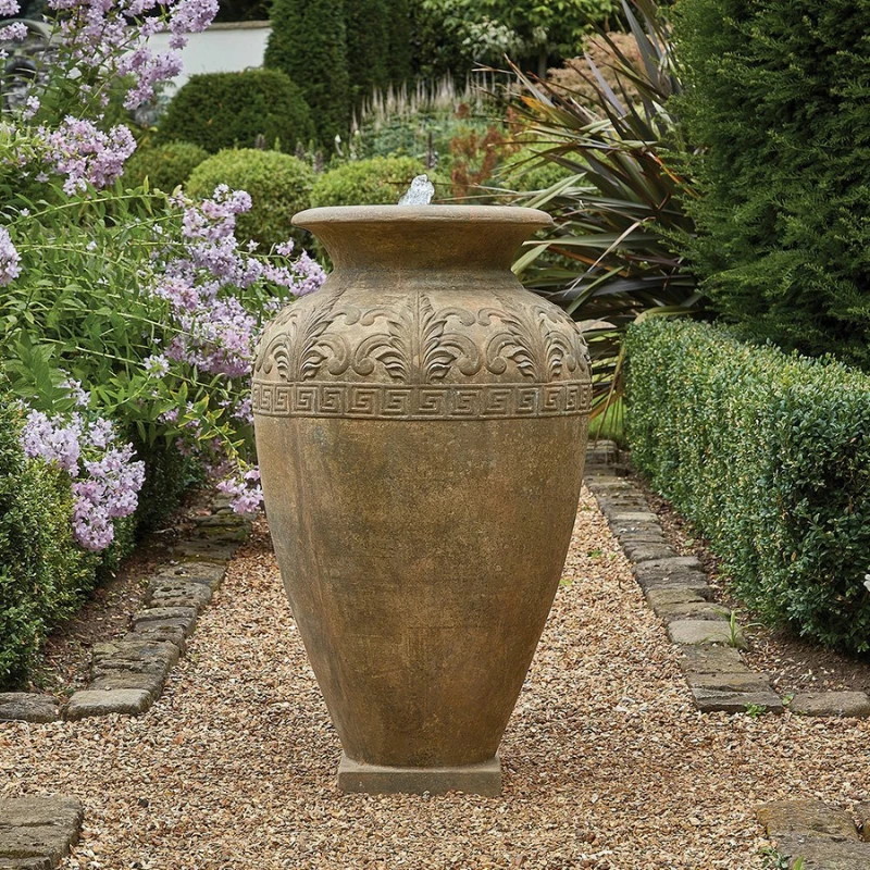 This water feature has an antique natural stone finish, reminiscent of the pots and jars of a time long gone. It is decorated with acanthus leaves which adds to the majestic nature of this garden water feature, which gives an elegant touch to any garden.